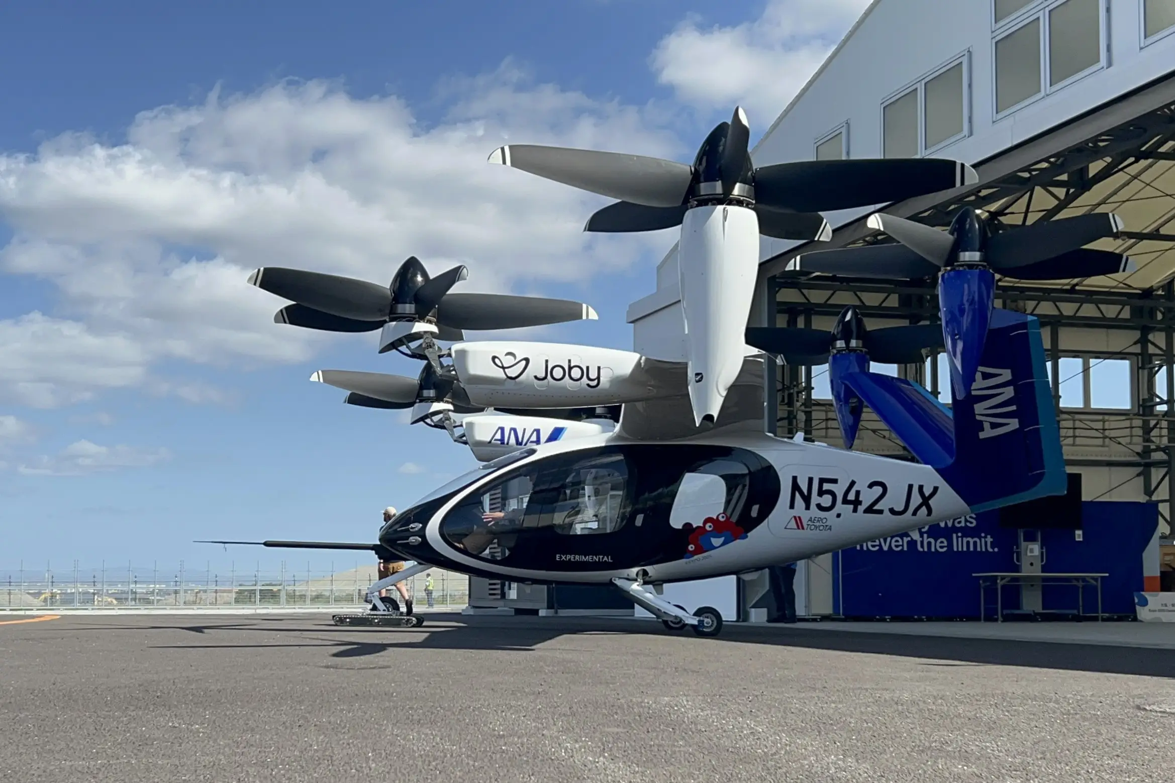 夏の暑さが残る青空の下、バーティポート(垂直離着陸場)のフェンス前には、期待に胸を膨らませた多くの観客が集まっていました。大きな格納庫から、ゆっくりと姿を現したのは「空飛ぶクルマ」として知られるeVTOL(電動垂直離着陸機)。白いJobyの機体にANAを象徴する青のカラーリングが施され、側面には大阪・関西万博の公式キャラクター「ミャクミャク」の姿ものぞく、特別仕様の「Joby S4」です。