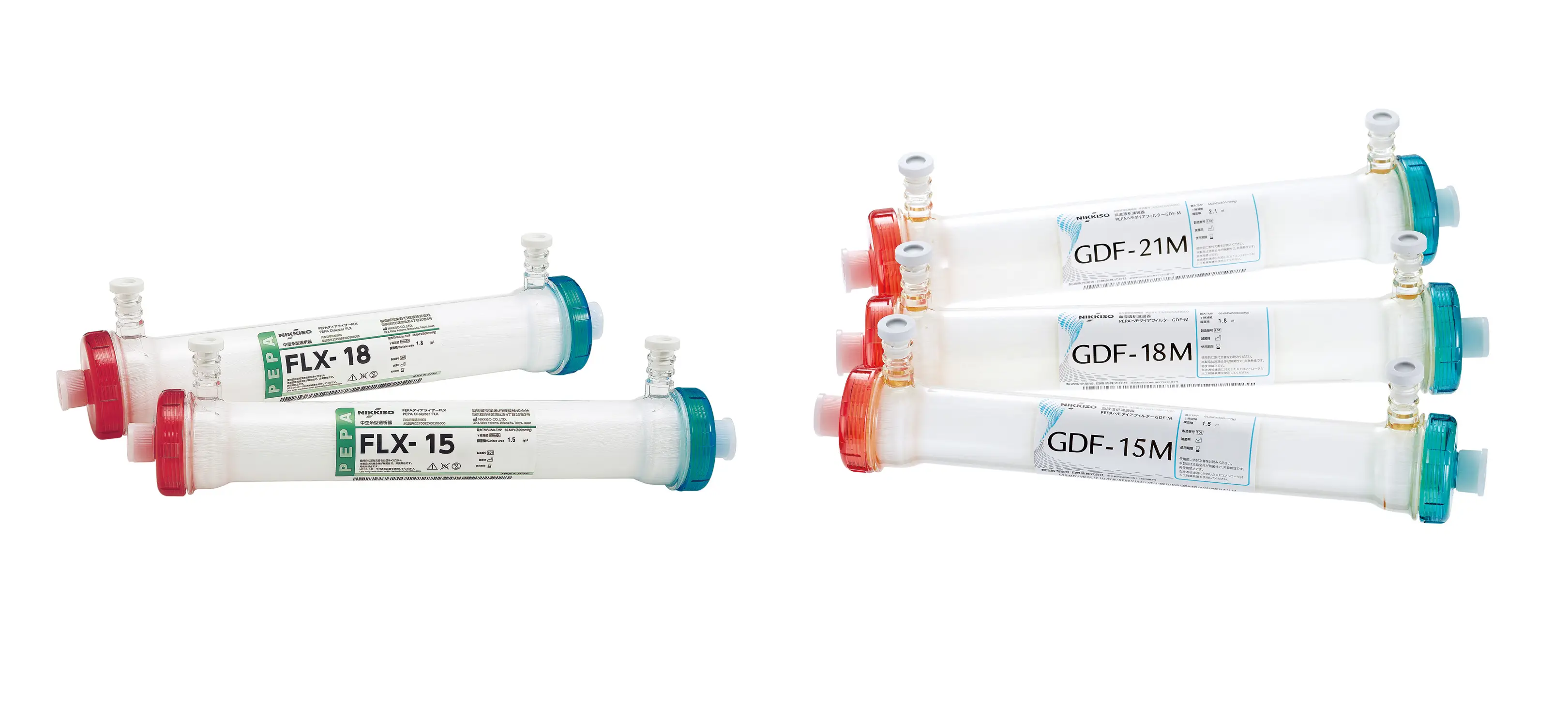 透析器(ダイアライザー(左)、ヘモダイアフィルター(右))